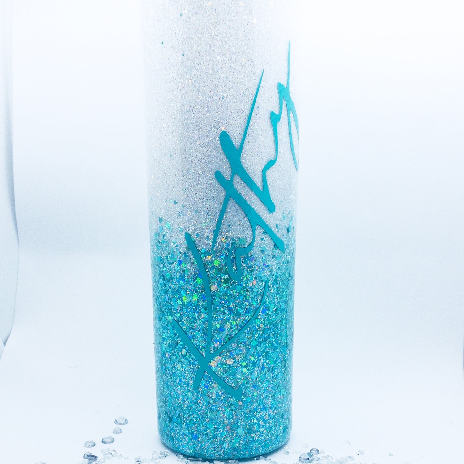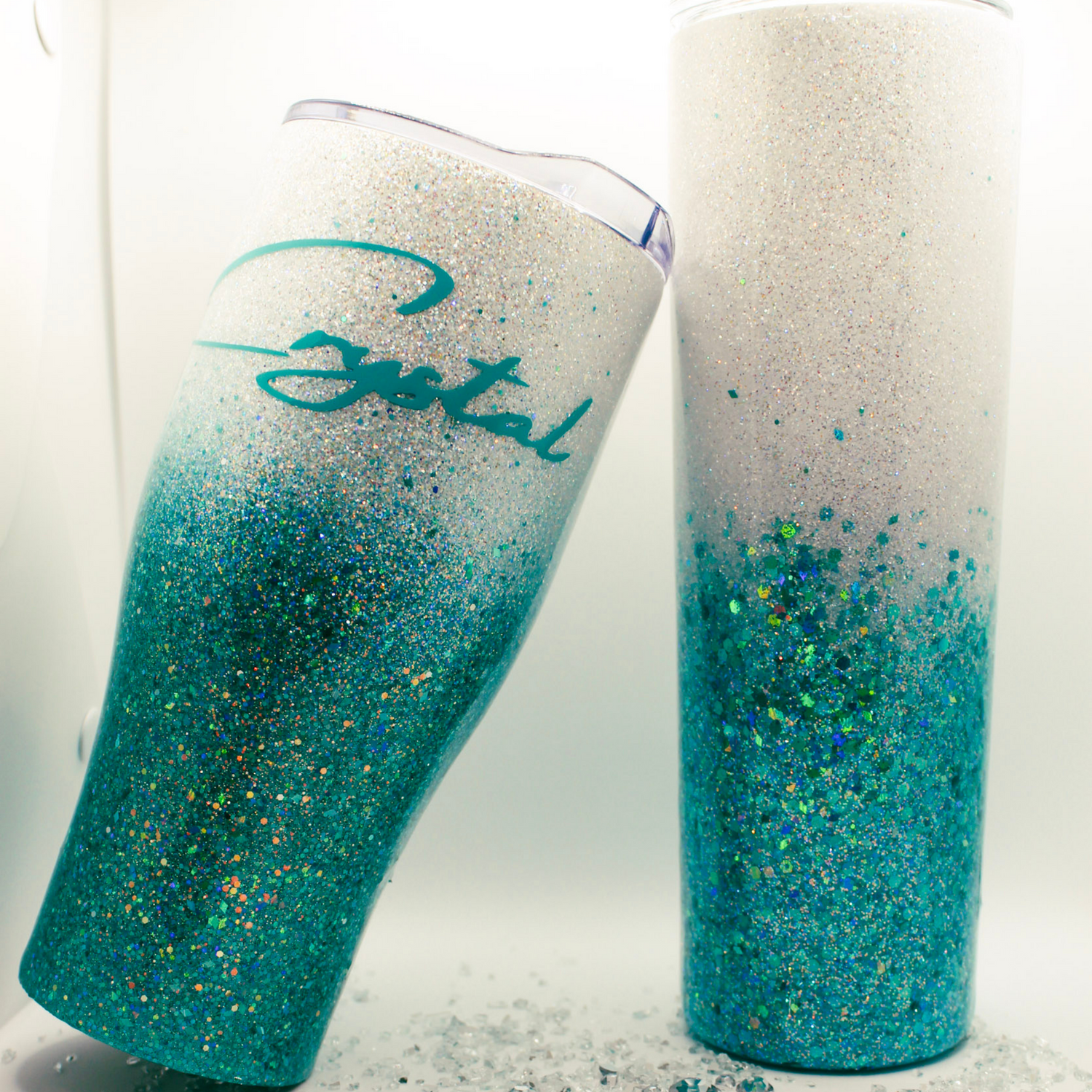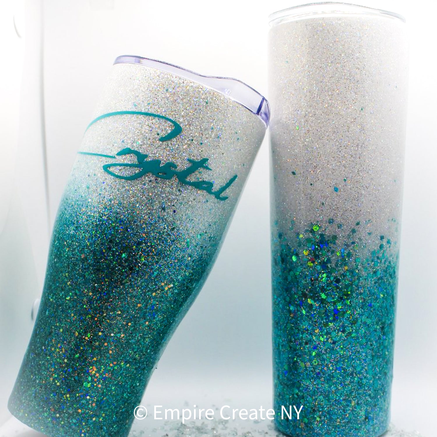 30oz Skinny Custom Personalized Stainless Steel Insulated Teal And White Glitter Tumbler Cup With Straw And Lid. A safe and stylish way of keeping drinks hot or cold for hours. Multiple styles and sizes available. All cups are made to order and personalized at customers request.