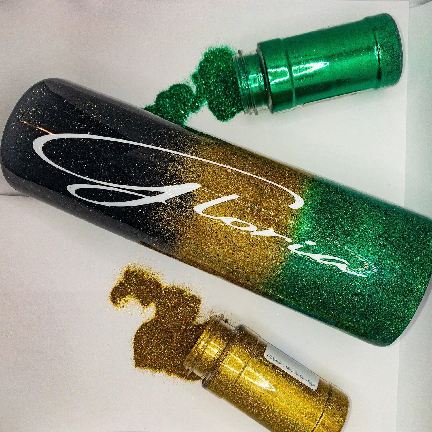 30oz Skinny Custom Personalized Stainless Steel Insulated Black, Yellow and Green Glitter Tumbler Cup With Straw And Lid. A safe and stylish way of keeping drinks hot or cold for hours.