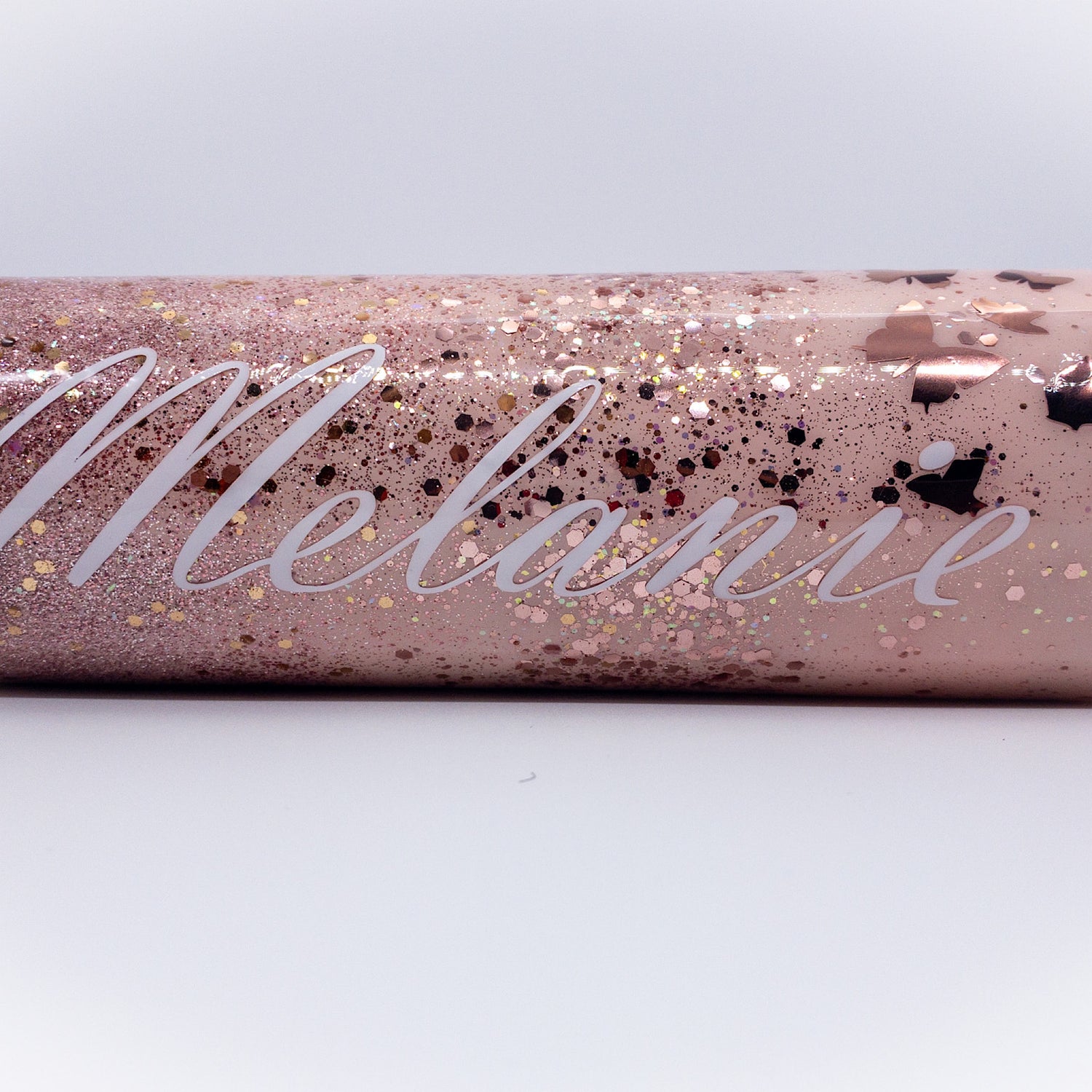 30oz Custom Personalized Stainless Steel Insulated Rose Gold And Pink Glitter Tumbler Cup With Straw And Lid. A safe and stylish way of keeping drinks hot or cold for hours. All cups are made to order and personalized at customers request. Multiple styles and sizes available.