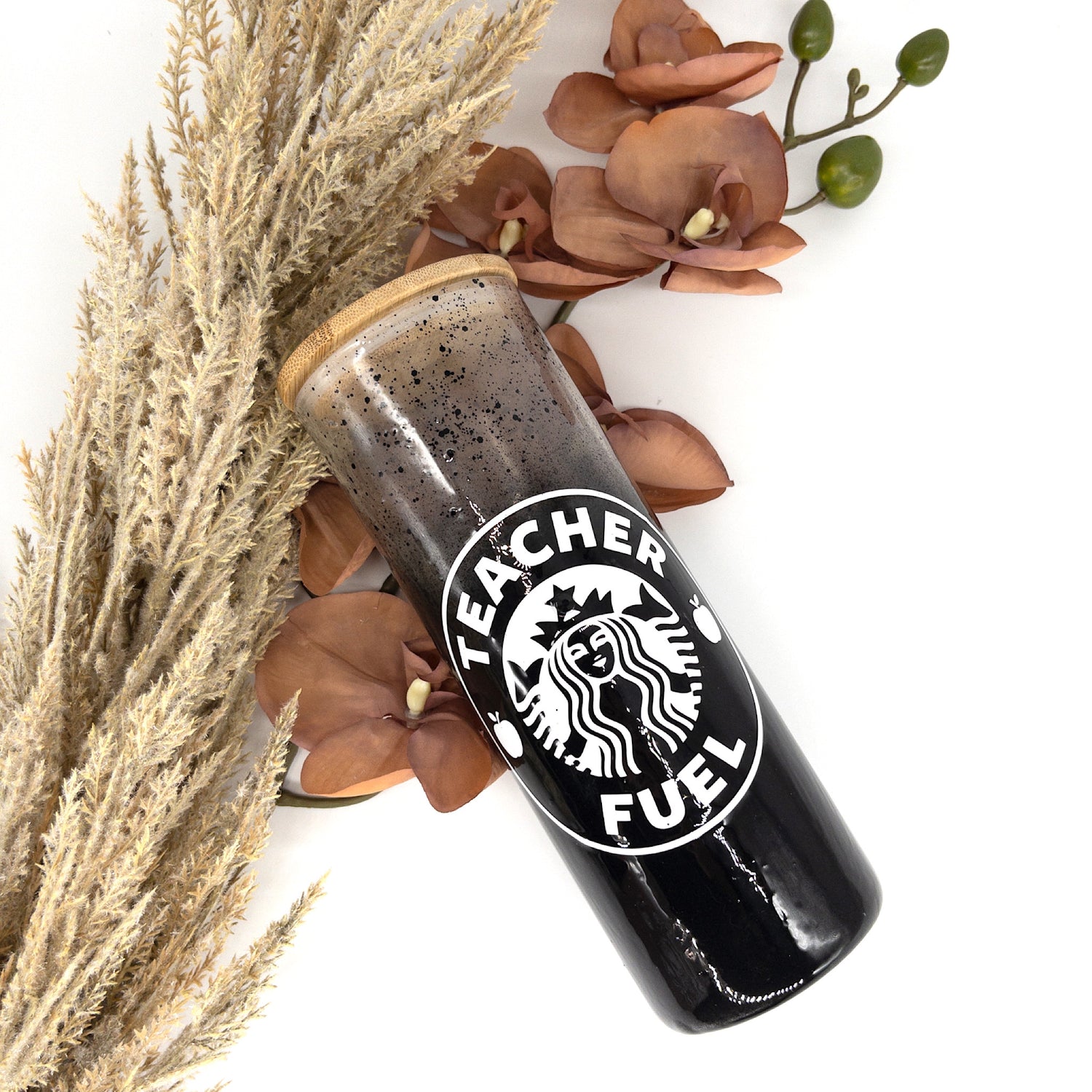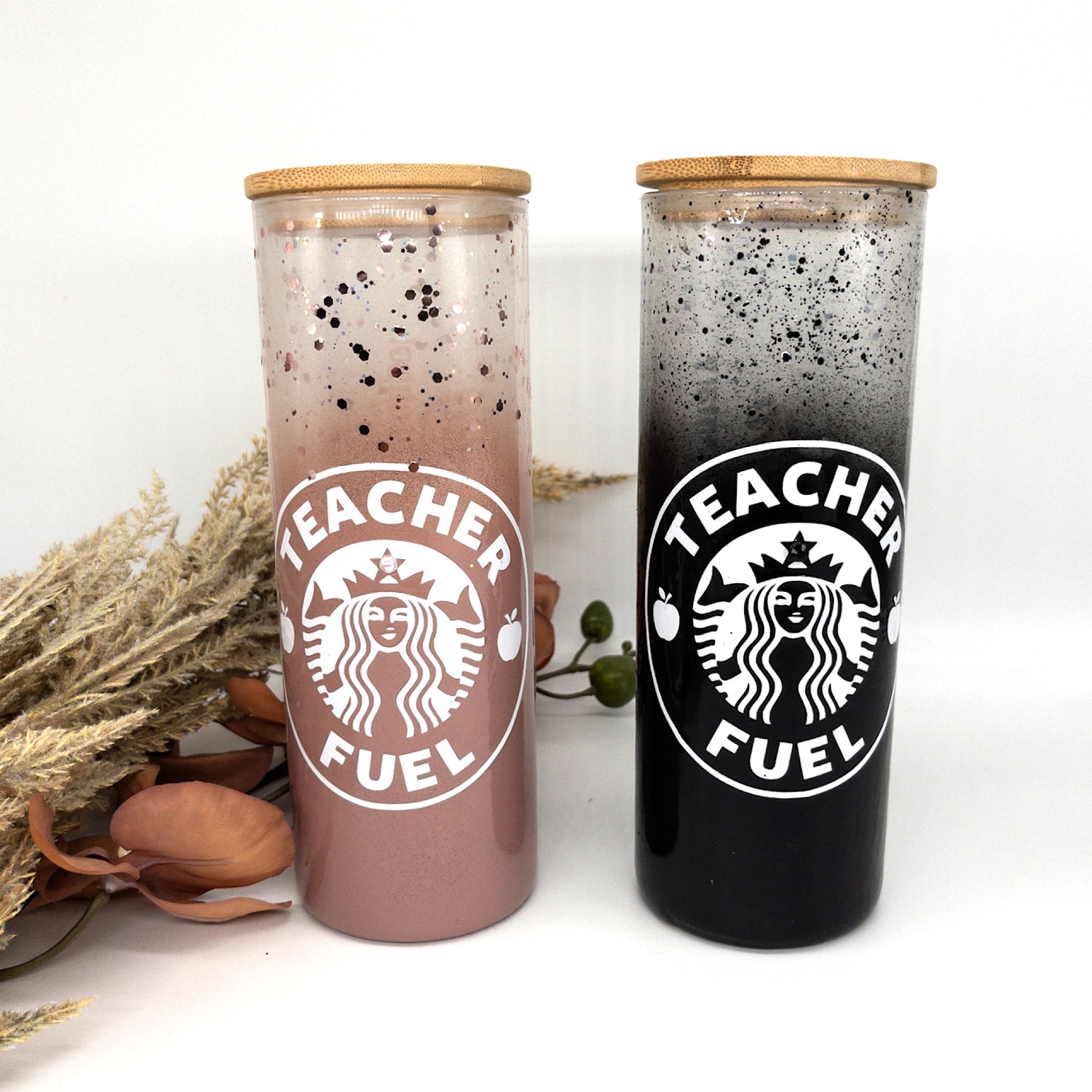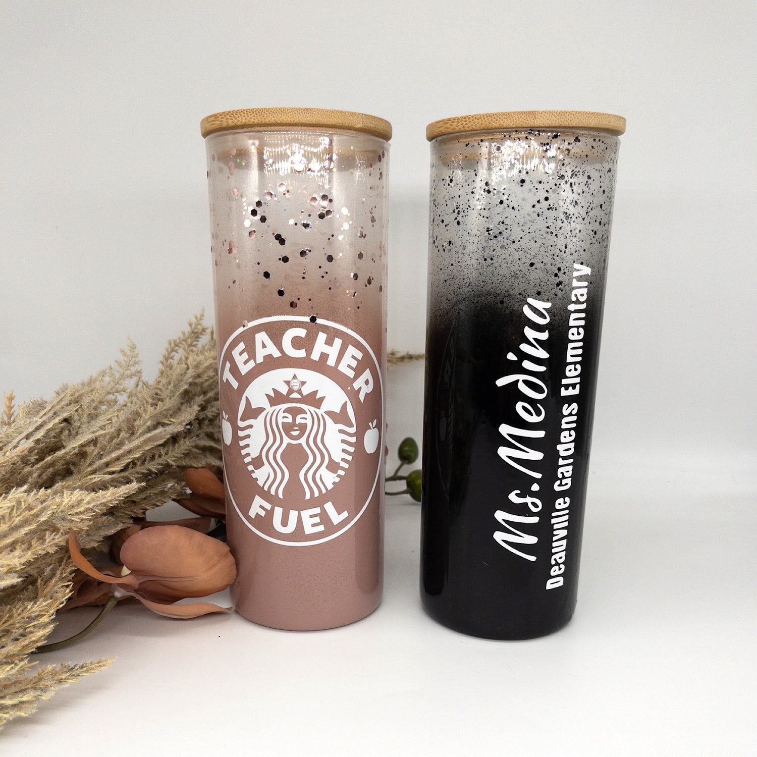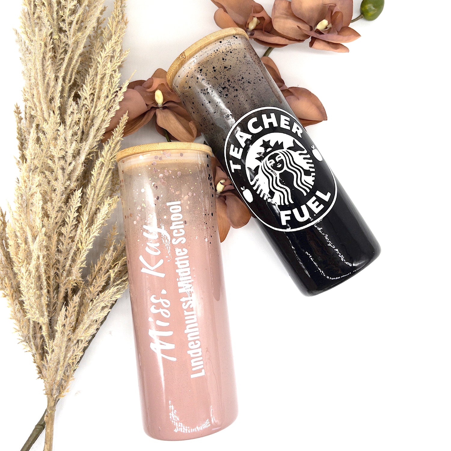20oz Frosted Glass Matte Glitter Teacher Starbucks Tumbler. Tumbler comes with a bamboo lid, clear lid and a straw. Great personalized gift for teachers.