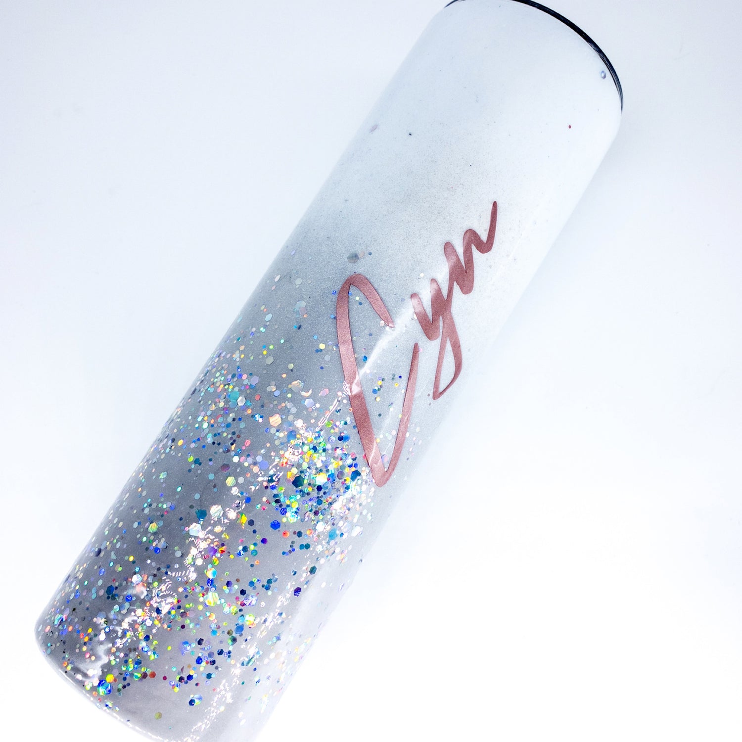 30oz Custom Personalized Stainless Steel Insulated Silver Grey White Ombre Glitter Tumbler Cup With Straw And Lid. A safe and stylish way of keeping drinks hot or cold for hours. All cups are made to order and personalized at customers request. Multiple styles and sizes available.