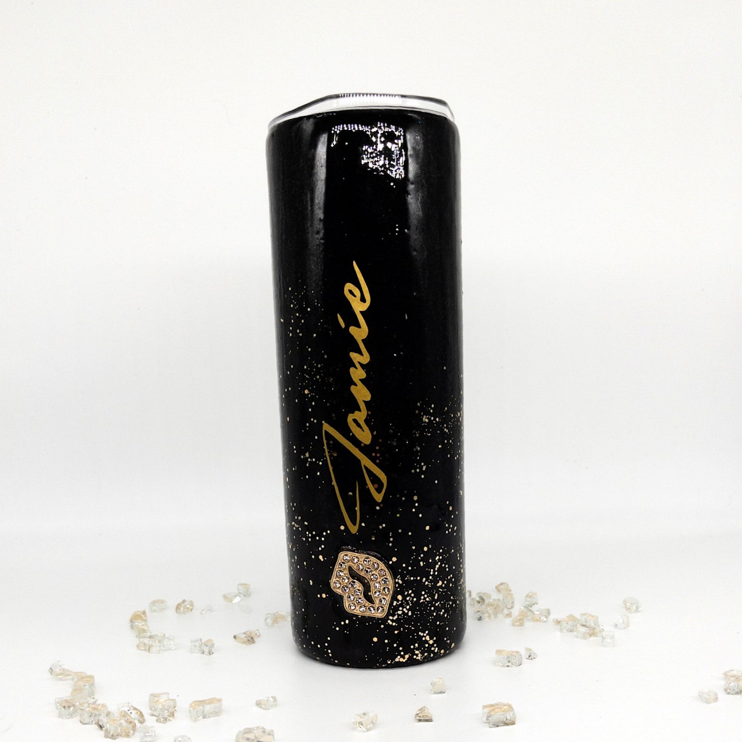 Custom Personalized Black Gold Rhinestone Glitter Tumbler Cup With Lid