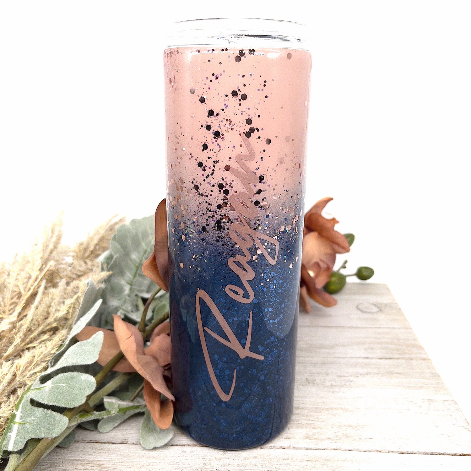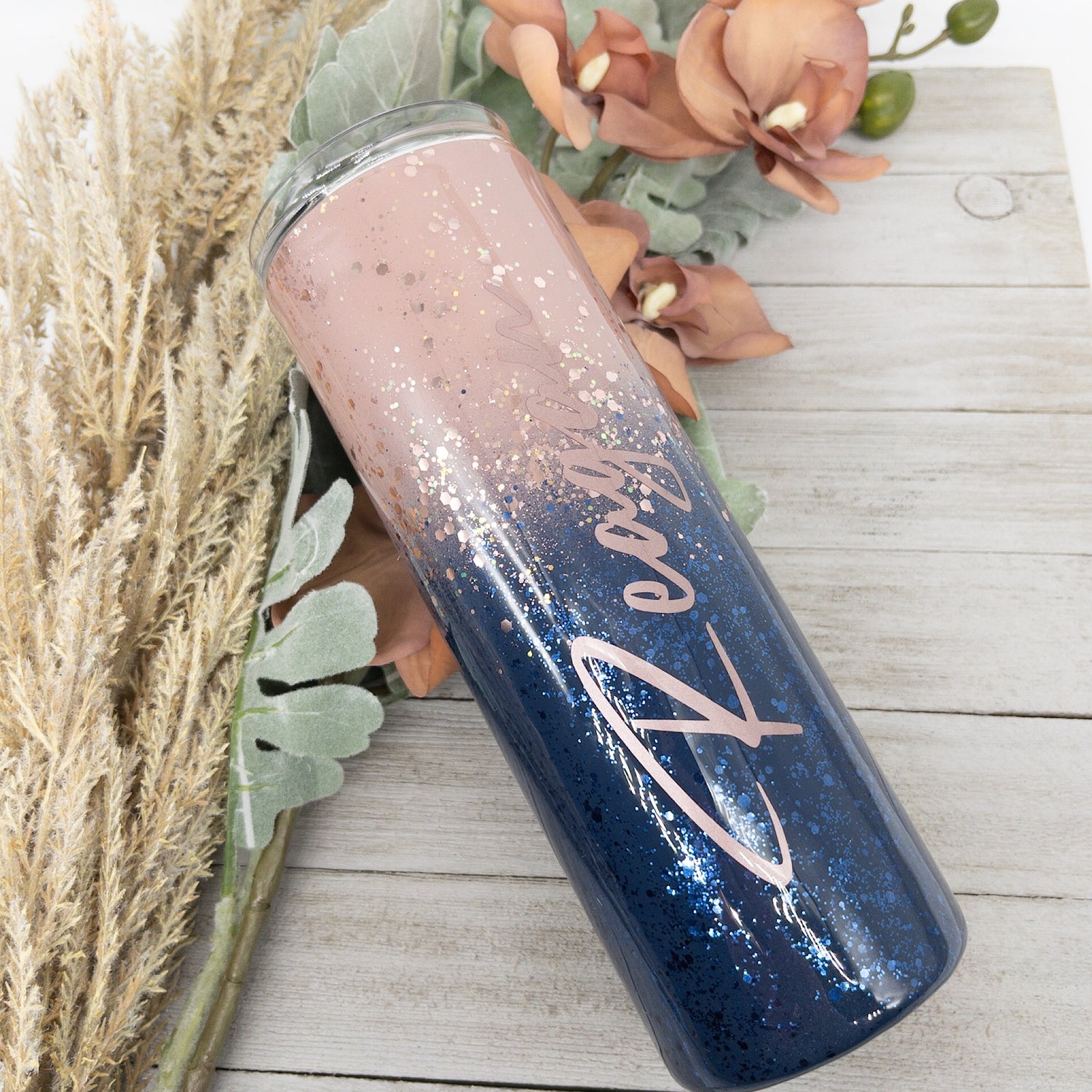 Custom Personalized Blush and Navy Blue Ombre Glitter Tumbler Cup With Lid