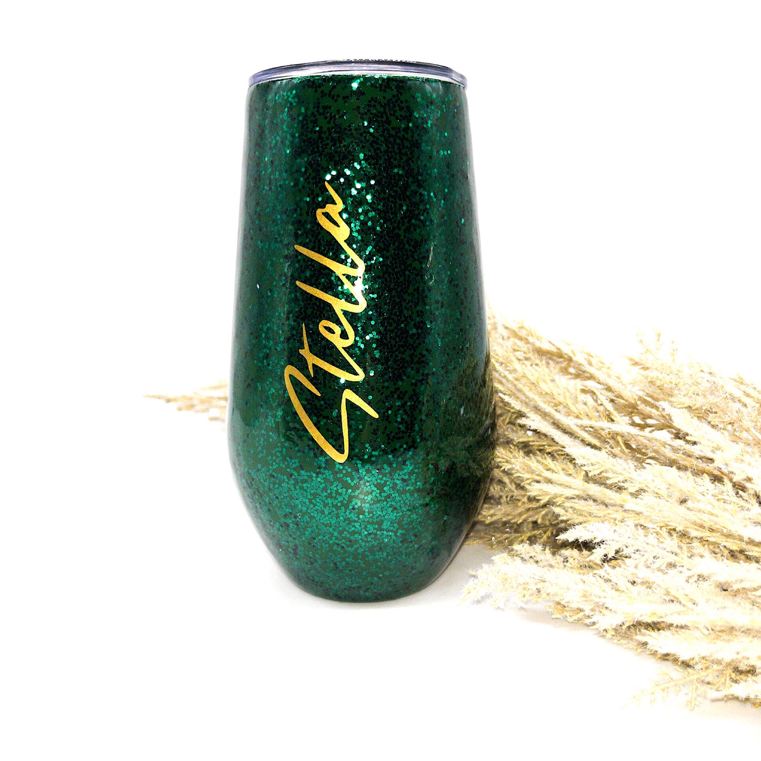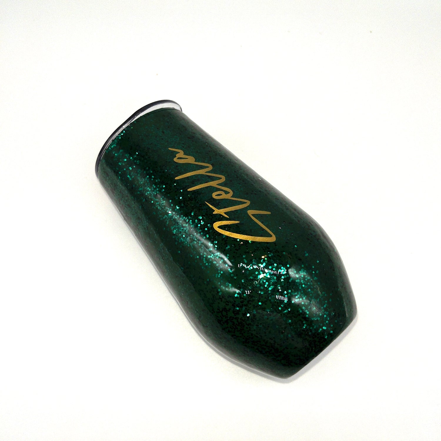 30oz Custom Personalized Stainless Steel Insulated Emerald Green Glitter Stemless Wine Tumbler Cup With Straw And Lid. A safe and stylish way of keeping drinks hot or cold for hours. All cups are made to order and personalized at customers request. Multiple styles and sizes available.