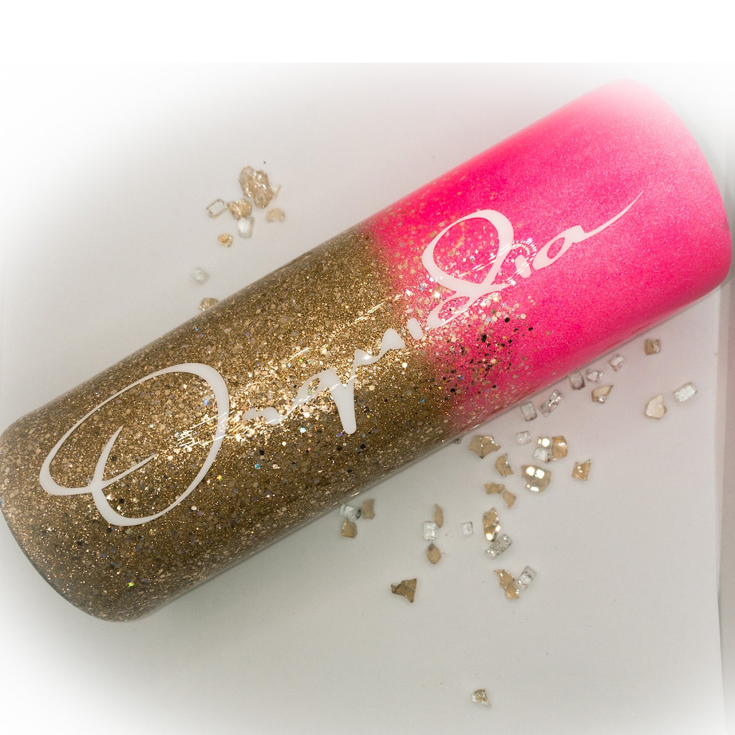 30oz Custom Personalized Stainless Steel Insulated Gold And Hot Pink Ombre Glitter Tumbler Cup With Lid And Straw. A safe and stylish way of keeping drinks hot or cold for hours. All cups are made to order and personalized at customers request. Multiple styles and sizes available.