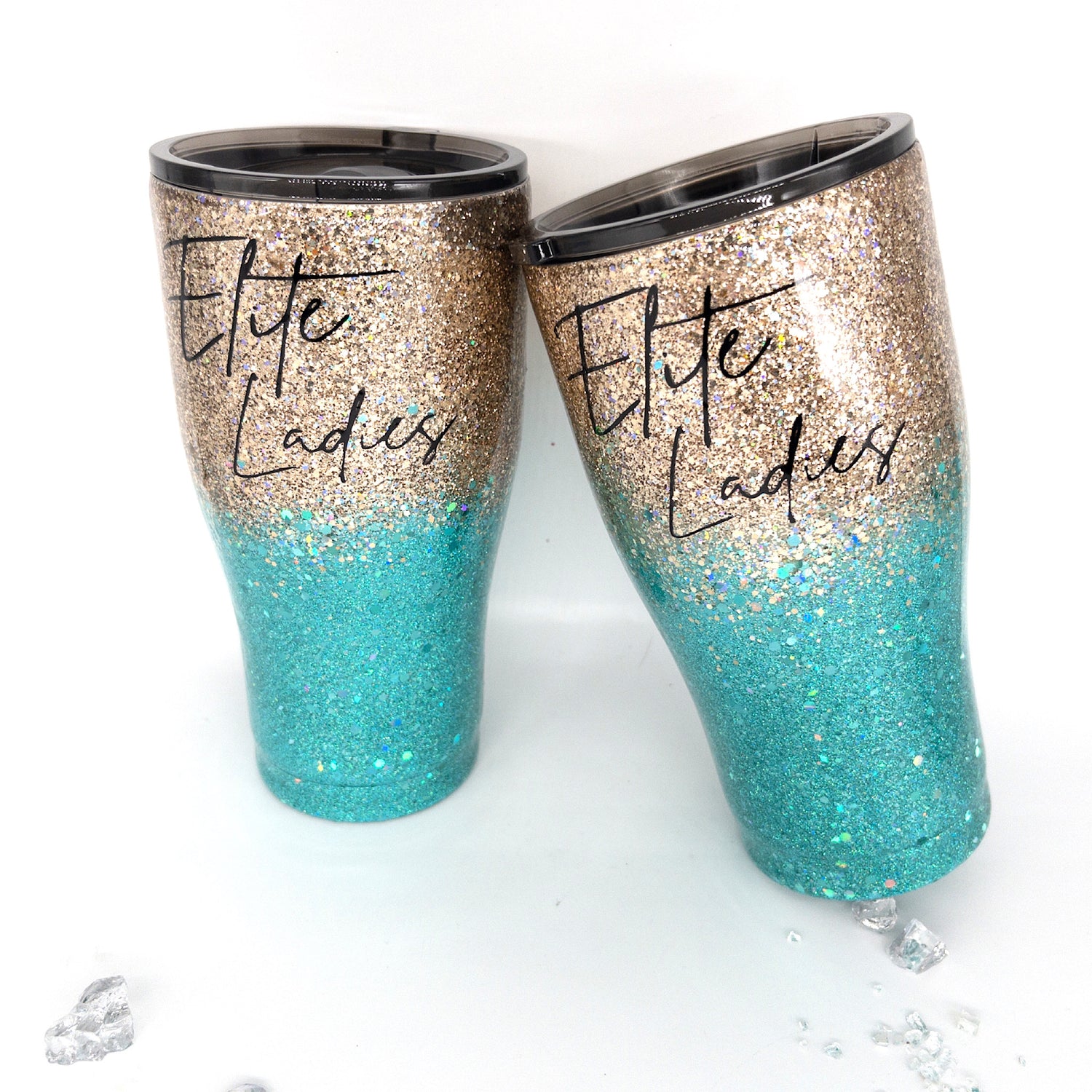 30oz Custom Personalized Stainless Steel Insulated Teal And Gold Glitter Sparkly Tumbler Cup With Straw And Lid. A safe and stylish way of keeping drinks hot or cold for hours. All cups are made to order and personalized at customers request. Multiple styles and sizes available.
