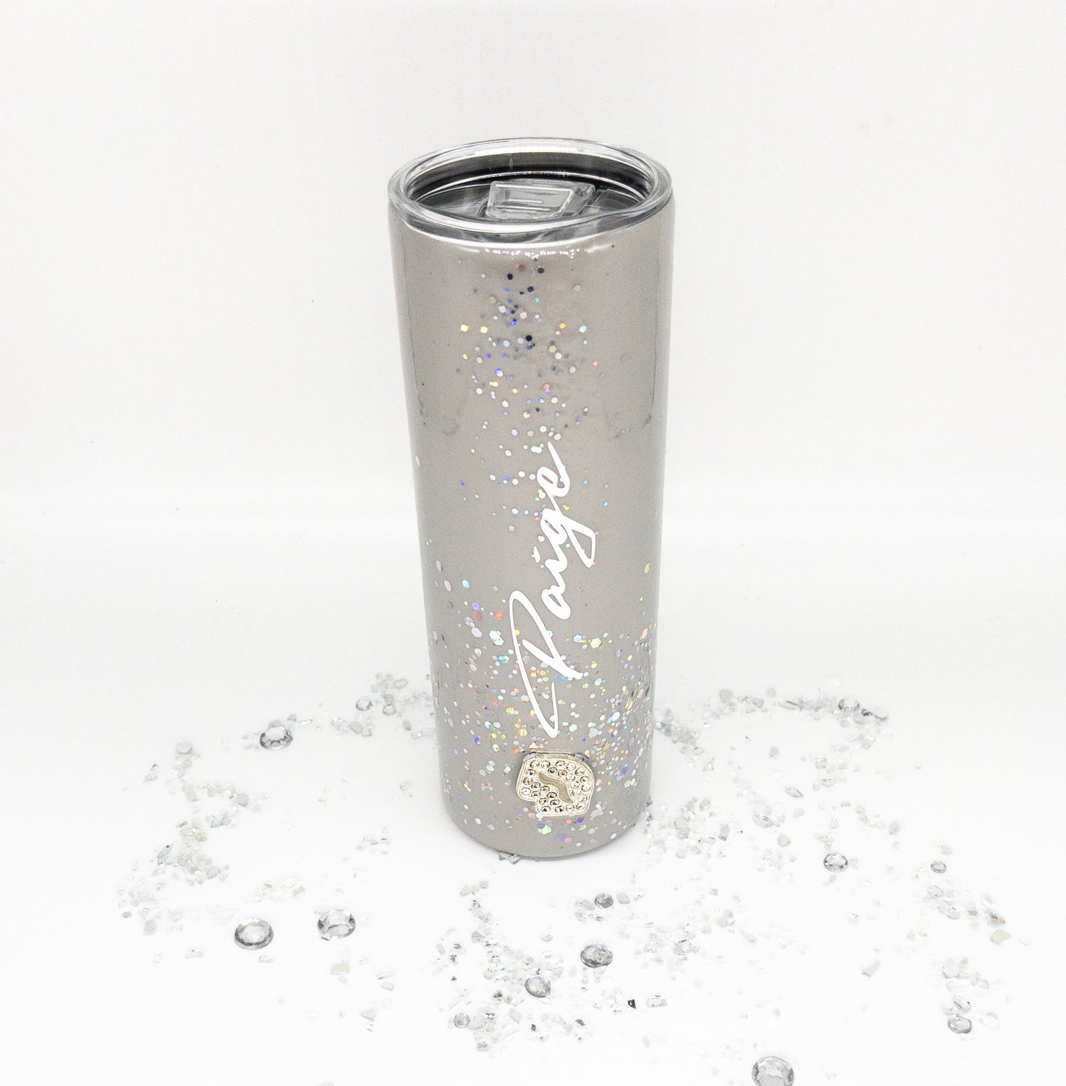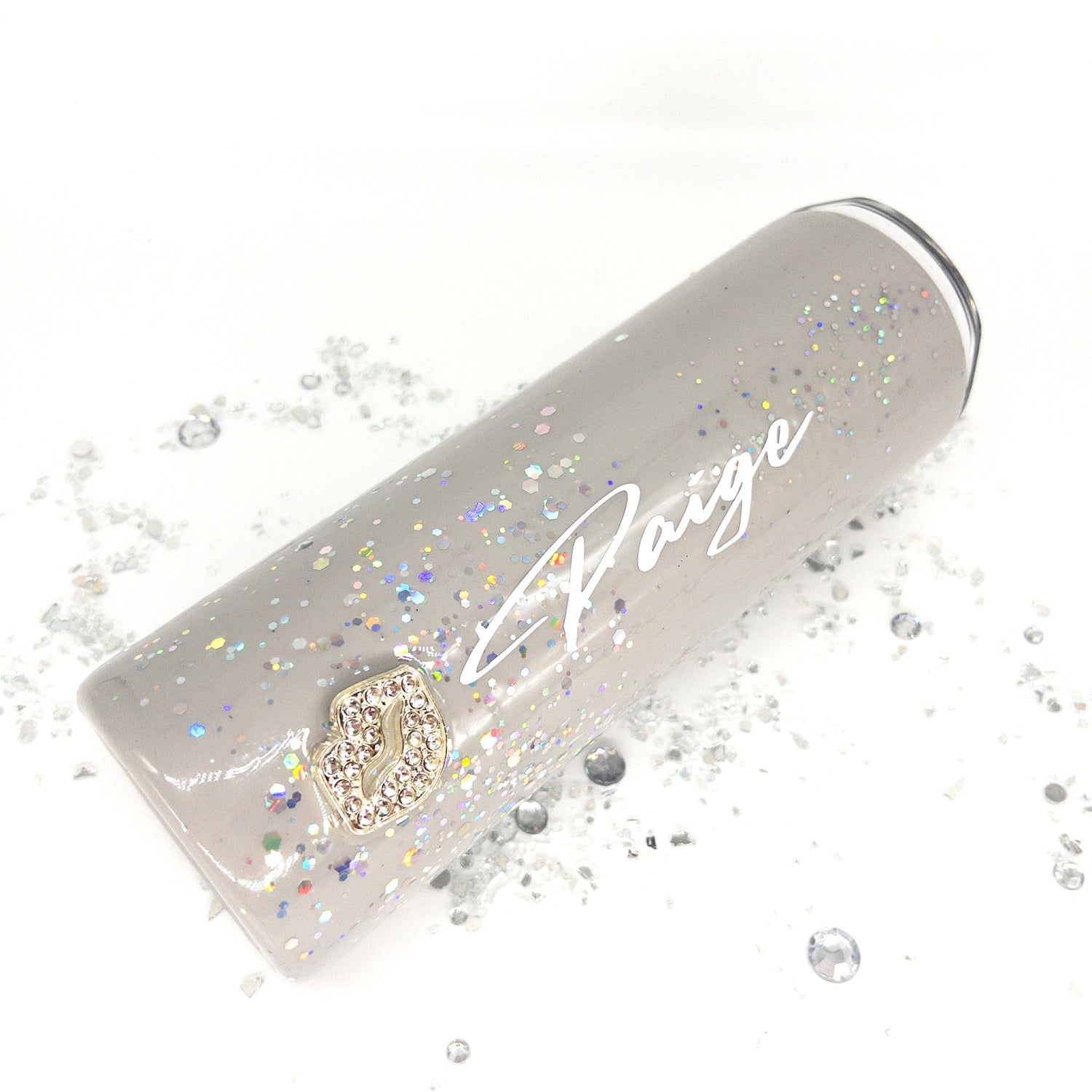 30oz Custom Personalized Stainless Grey Silver Rhinestone Glitter Tumbler Cup With Straw And Lid. A safe and stylish way of keeping drinks hot or cold for hours. All cups are made to order and personalized at customers request. Multiple styles and sizes available.