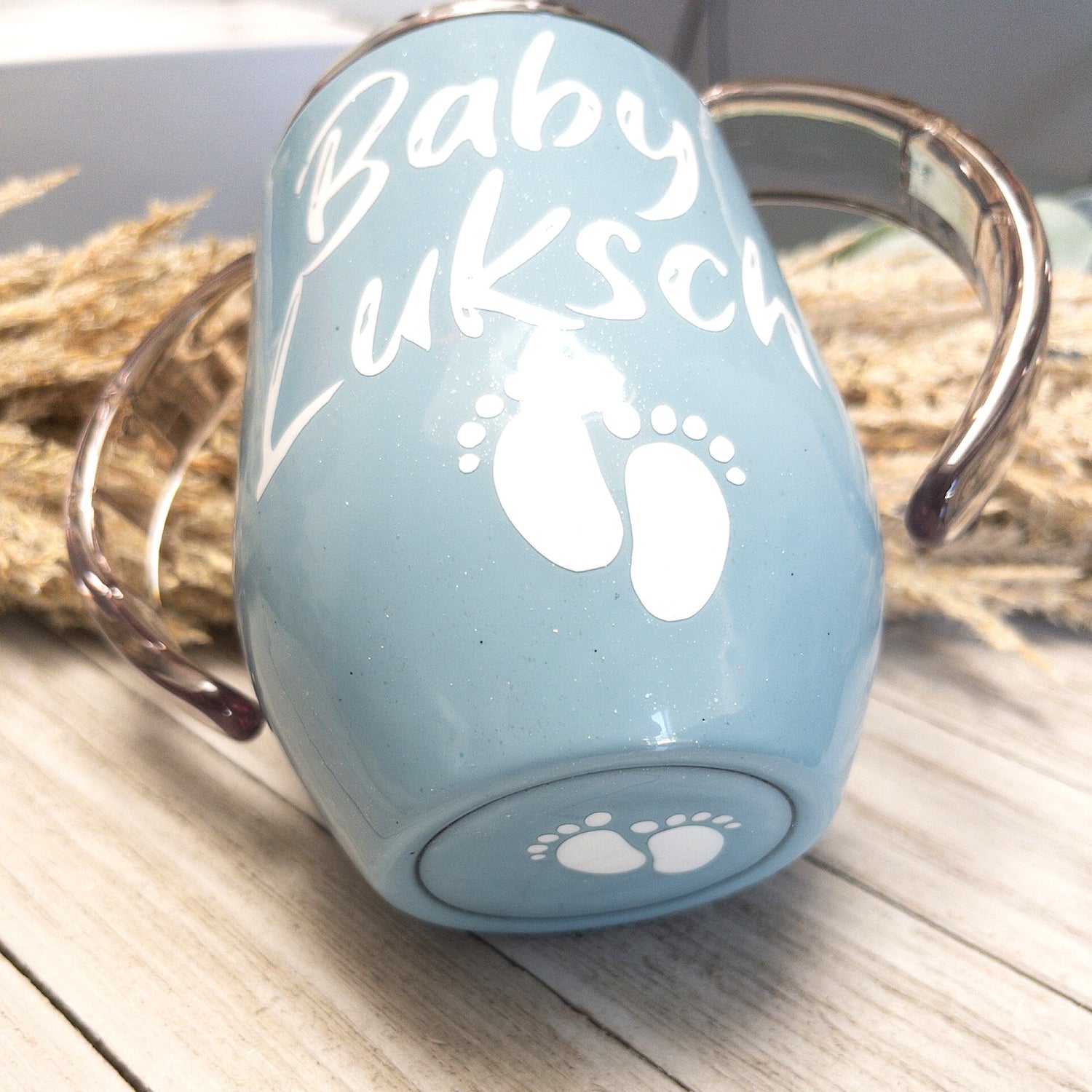 Whether at home, on-the-go, or during outings, this 14 ounce blue custom personalized sippy cup with a screw-on lid and handles is a practical and appealing choice for parents and caregivers seeking a reliable and charming drinking solution for their little ones
