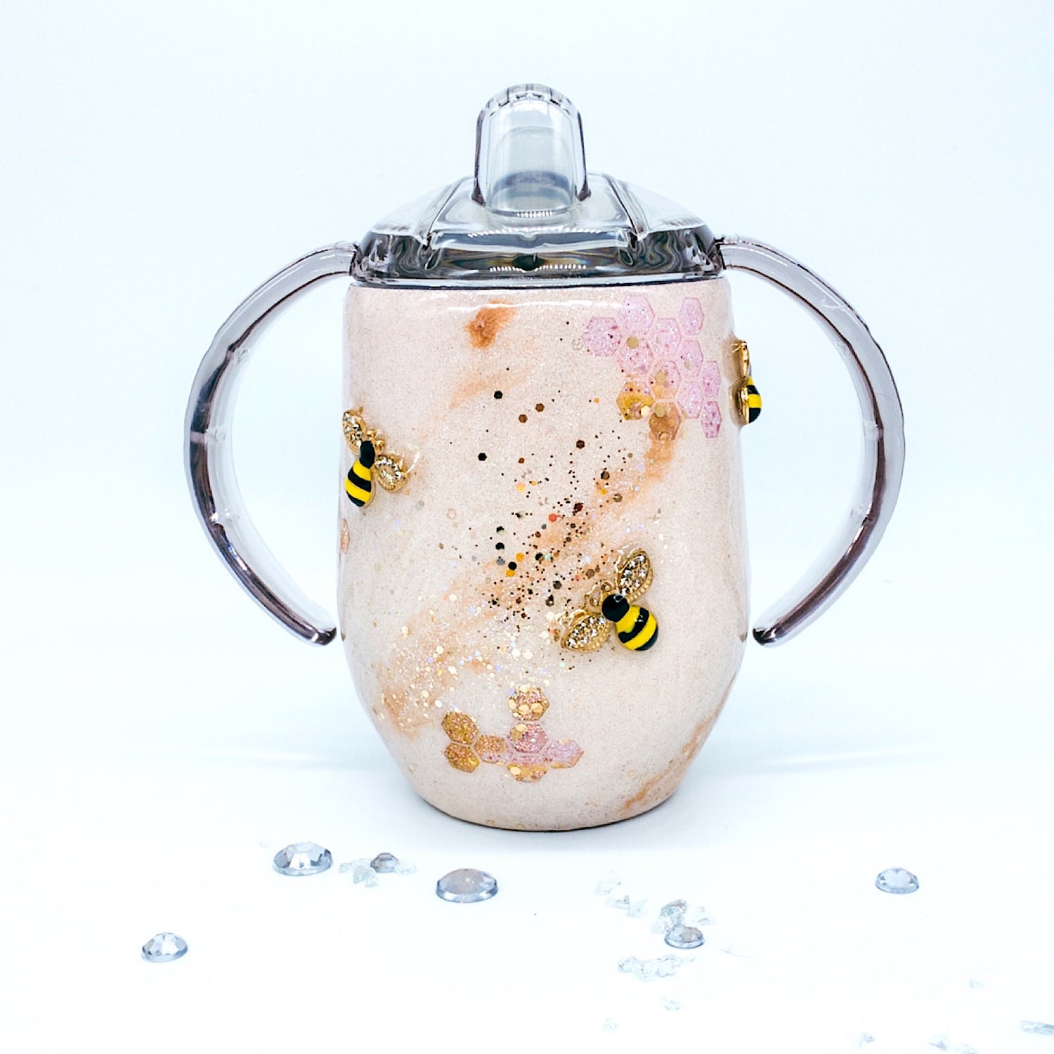 12oz Custom Personalized Rose Gold Thermal Insulated Stainless Steel Sippy Cup With Bumblebee Details. Lid comes with removable insert to help control drink flow. Keeps drink cold/hot for hours. Personalized at customers request.