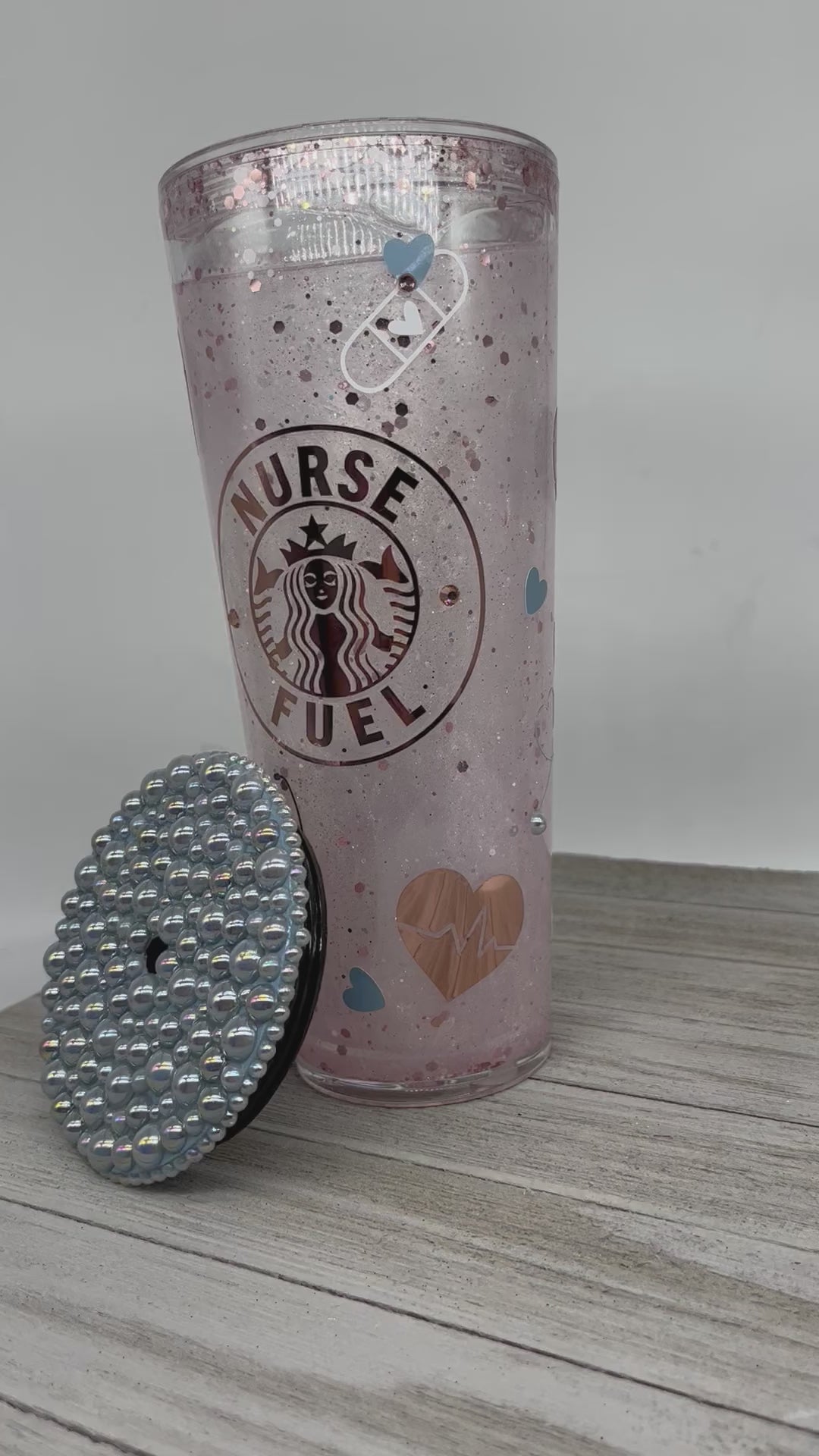 24oz Custom Personalized Nurse Fuel Rose Gold Blue Rose Glitter Snow Globe Tumbler Cup With Pearl Lid And Straw. A safe and stylish way of enjoying your cold drinks . All cups are made to order and personalized at customers request. Multiple styles and sizes available.