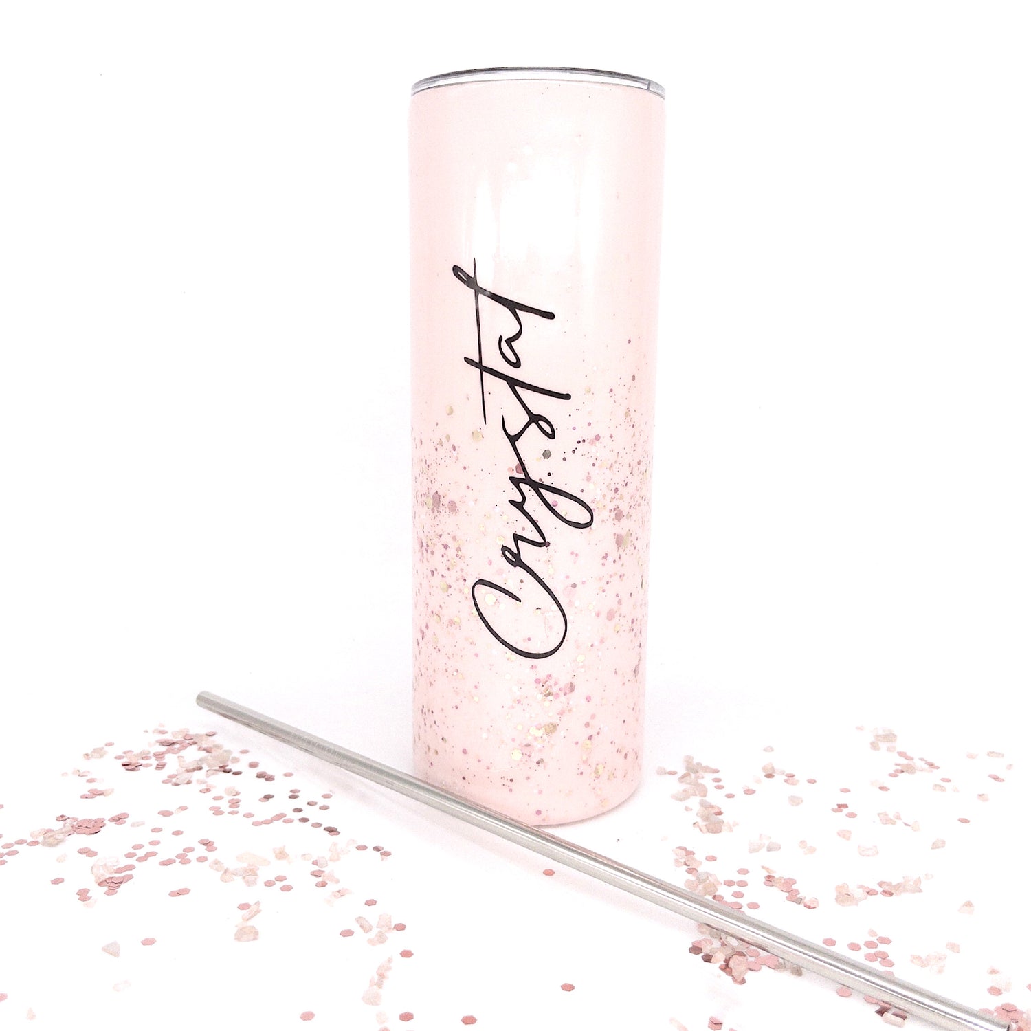 30oz Custom Personalized Stainless Steel Pink Glitter Tumbler Cup With Straw And Lid. A safe and stylish way of enjoying drinks hot or cold for hours. All cups are made to order and personalized at customers request. Multiple styles and sizes available.