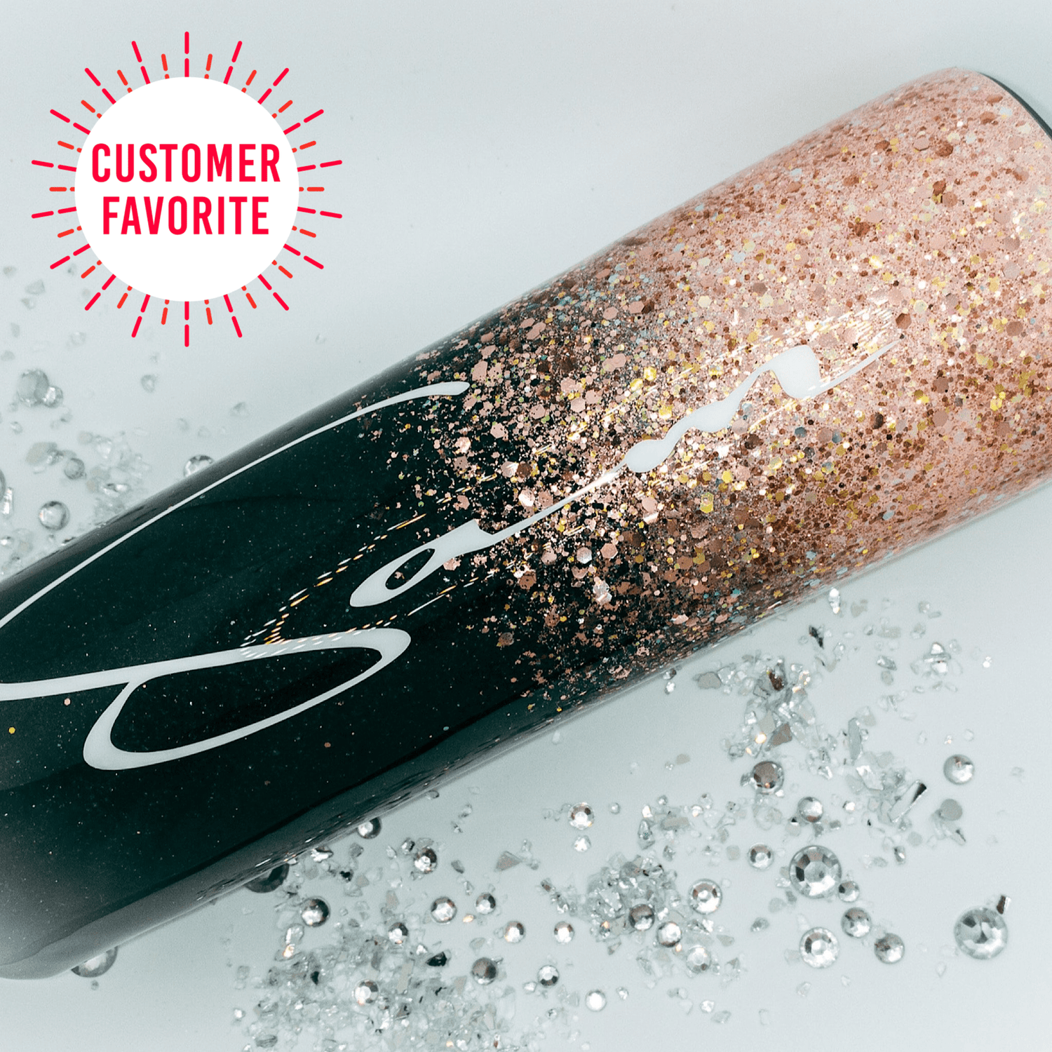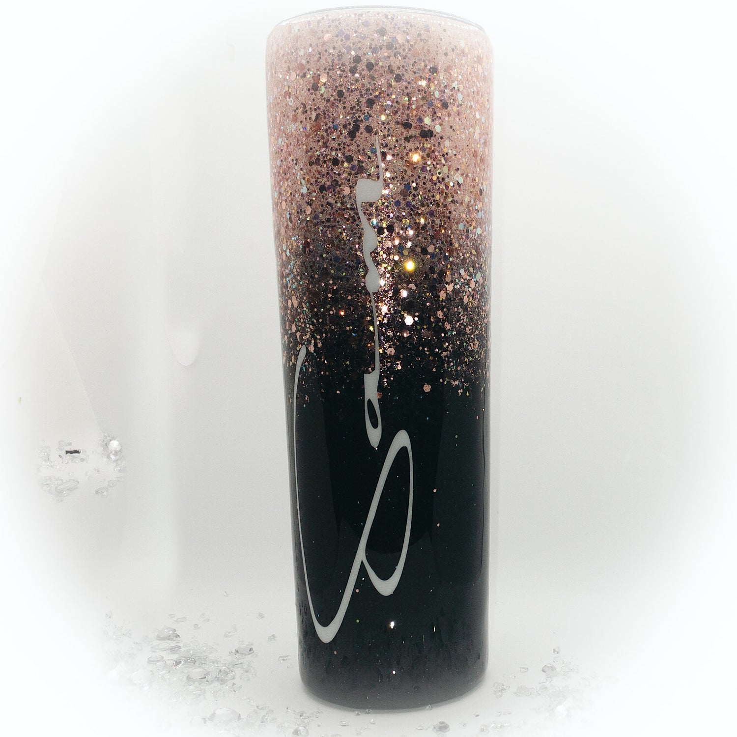 30oz Skinny Custom Personalized Stainless Steel Insulated Rose Gold And Black Glitter Ombre Tumbler Cup With Straw And Lid. A safe and stylish way of keeping drinks hot or cold for hours. Multiple styles and sizes available.