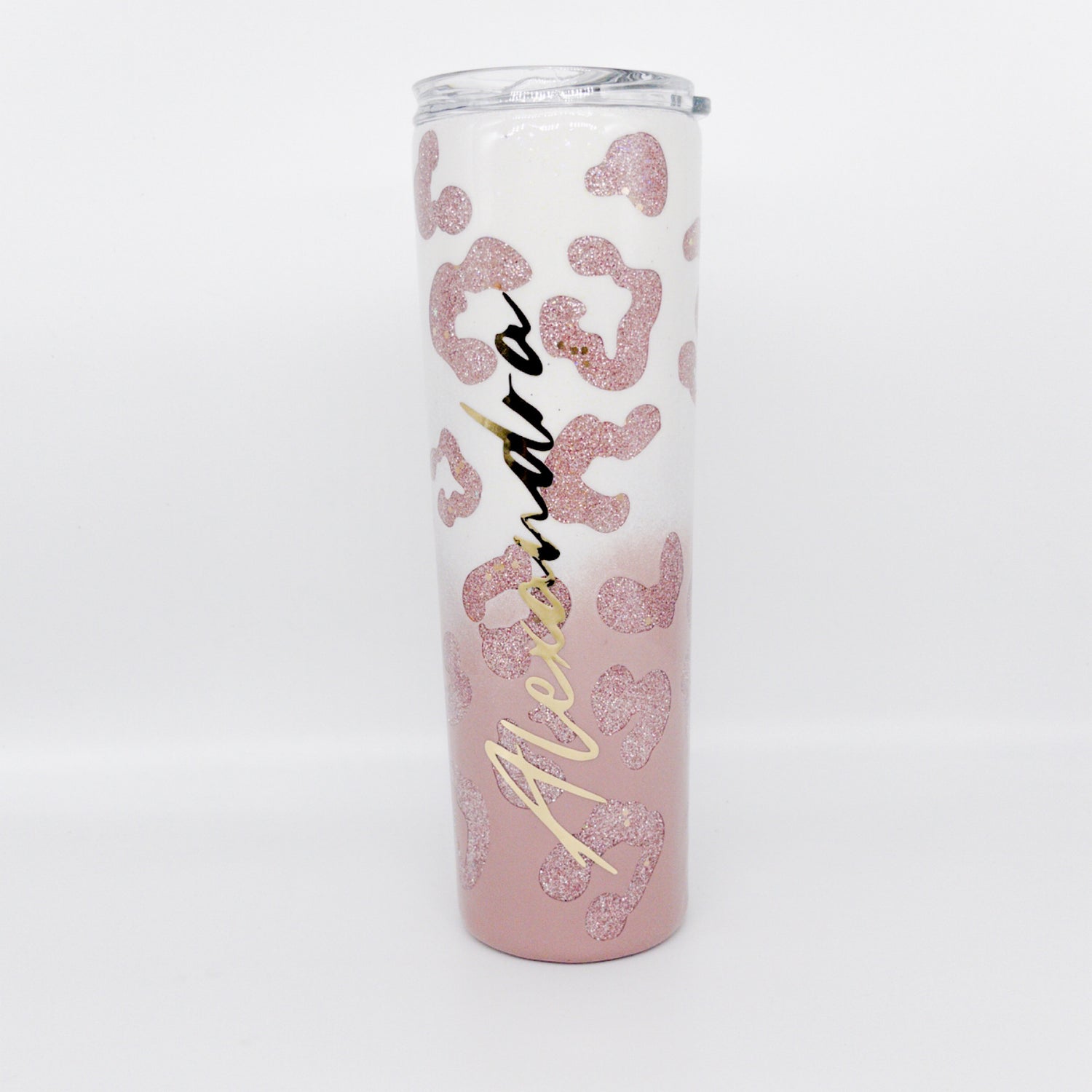 30oz Custom Personalized Stainless Steel Insulated Ombre Rose Gold Leopard Glitter Tumbler Cup With Straw And Lid. A safe and stylish way of keeping drinks hot or cold for hours. All cups are made to order and personalized at customers request. Multiple styles and sizes available.