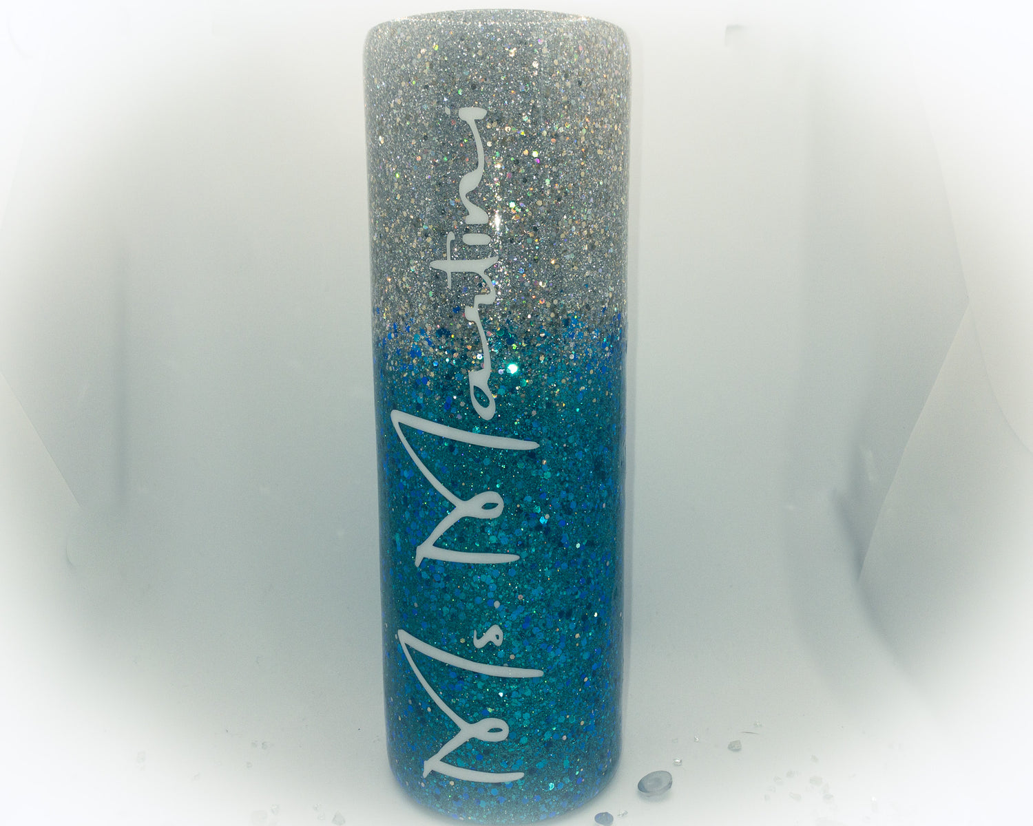 Custom Personalized Silver and Teal Skinny Glitter Ombre Tumbler Cup