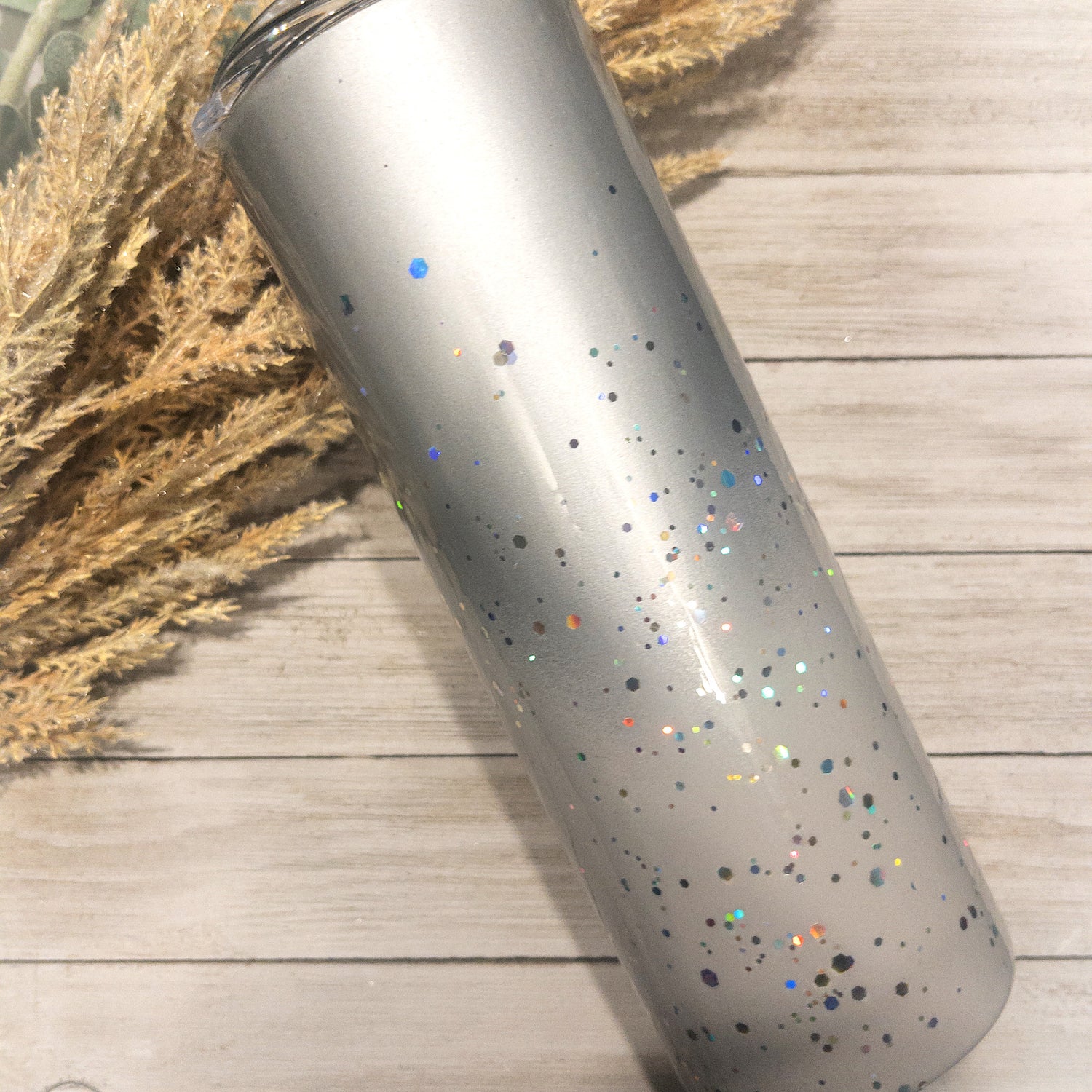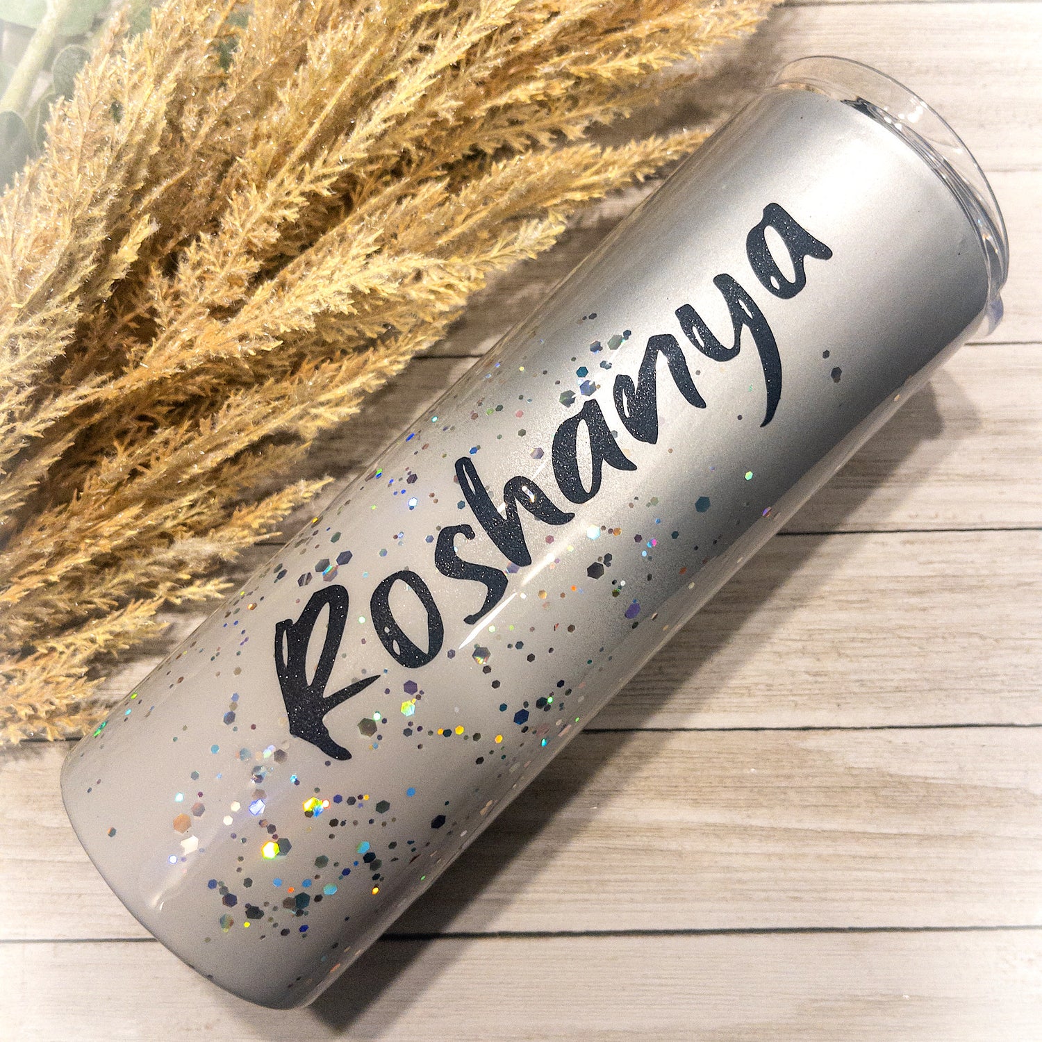 30oz Custom Personalized Stainless Steel Silver Grey Glitter Tumbler Cup With Straw And Lid. A safe and stylish way of enjoying drinks hot or cold for hours. All cups are made to order and personalized at customers request. Multiple styles and sizes available.