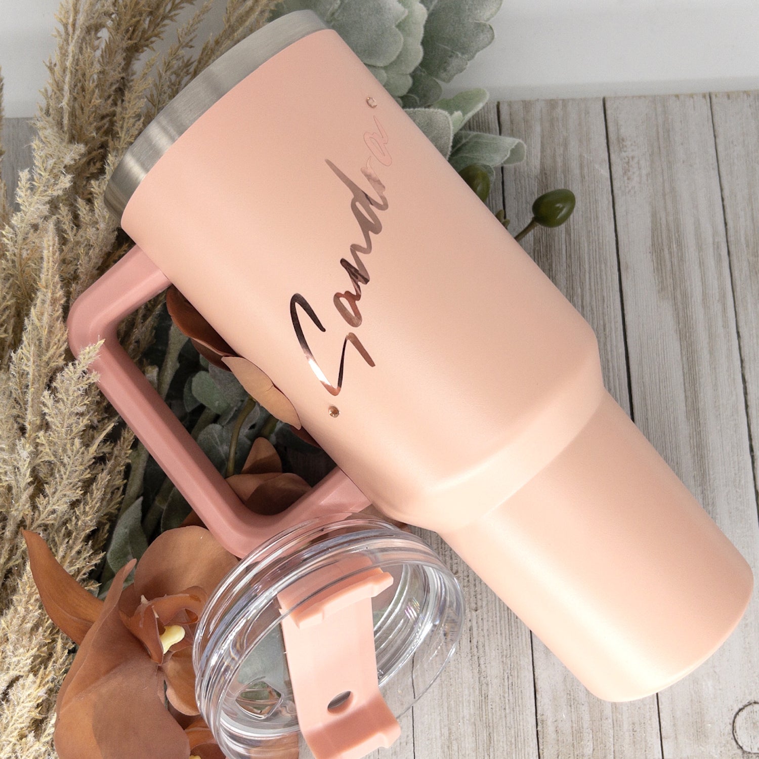 40oz Personalized Pink or Black Stainless Steel Insulated Tumbler Cup With Handle.