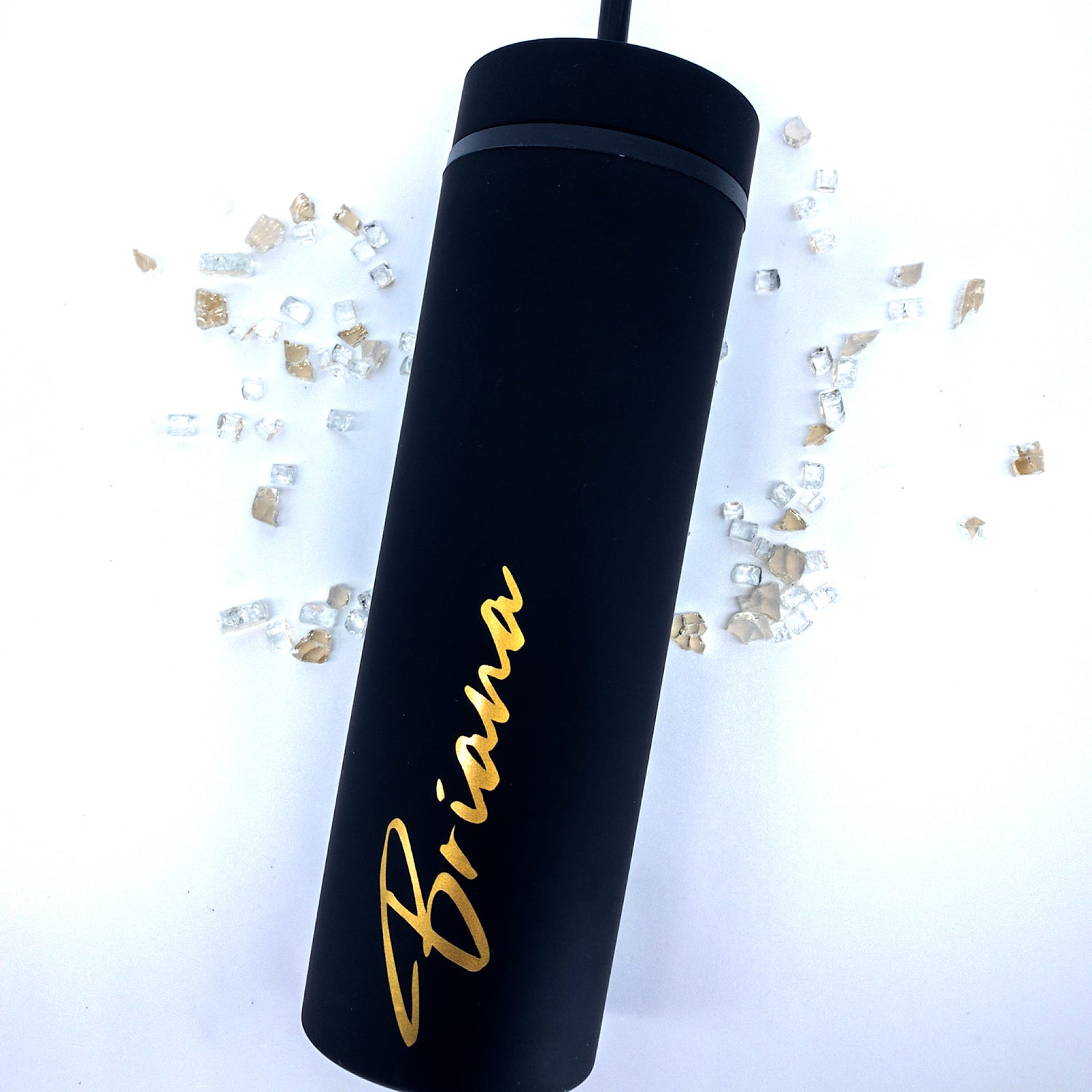 16oz Black Matte Personalized Tumbler AND Reusable Pink Cup Sleeve. Sleeve can also be used with your to go coffee like Starbucks and Dunkin Donuts!!